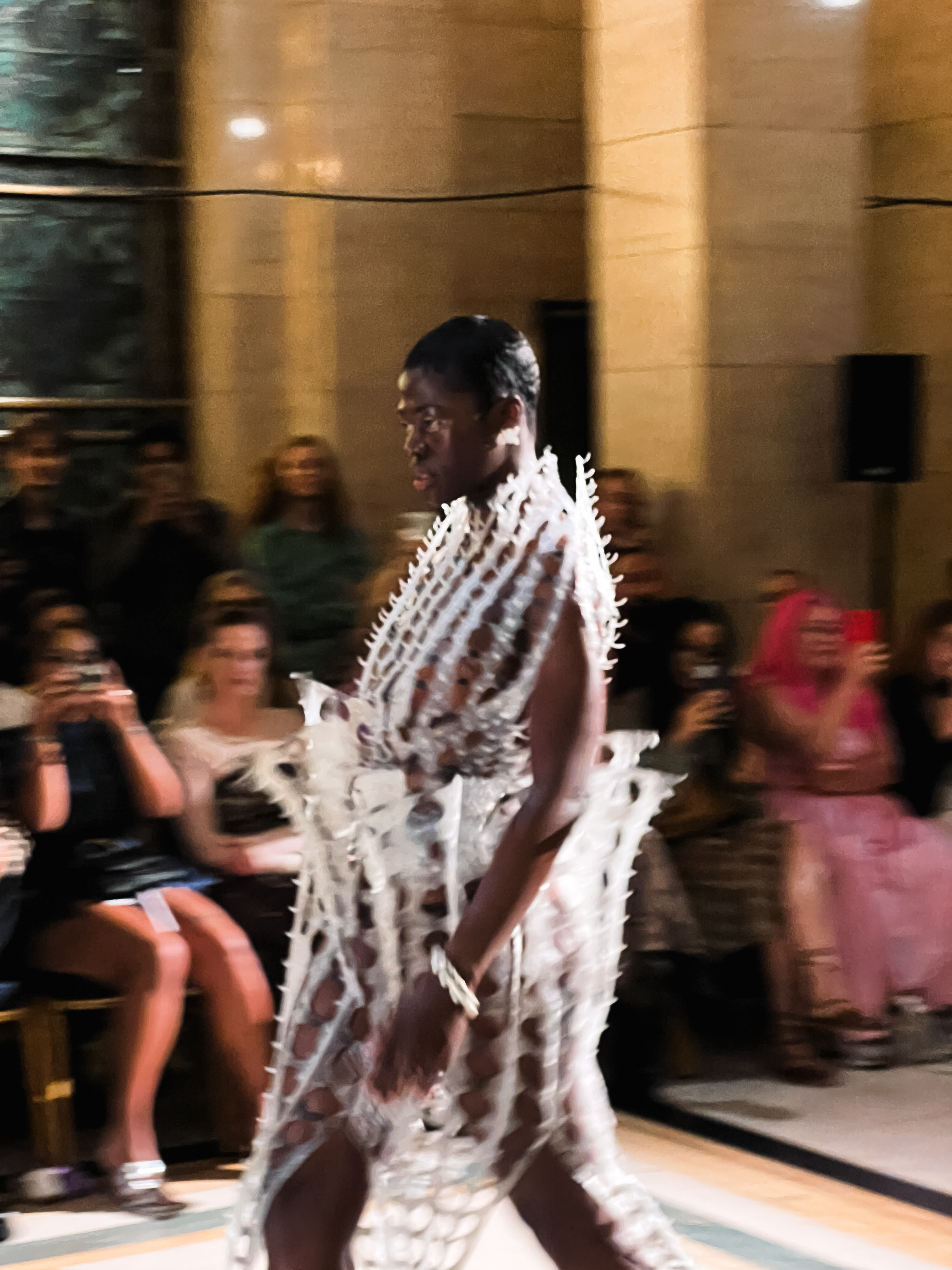 The collection featured 21 looks and highlighted Bond's focus on handcrafted pieces made from biocompatible, biodegradable TPU and PLA filaments, drawn with a 3D pen to achieve zero-waste garments. These designs evoke a futuristic second skin, merging sculpture with wearable forms.