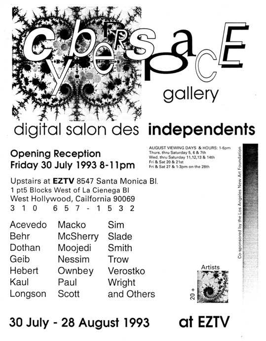 CyberSpace Gallery was, as you say, a logical step to formalise a commitment to digital art dating back at EZTV to the early 1980s. Digital artist Victor Acevedo introduced me to art historian and curator Patric Prince in 1989, when they proposed a major group show on digital art at EZTV. Patric was among the first art historians to see the immense implications of digital art. Her archives are now a central part of the Victoria & Albert Museum’s computer art collection. Patric curated for EZTV a pivotal group show of computer art in 1990. The show, called “Art 1990,” was very successful and a turning point for both EZTV as well as co-sponsor LA ACM SIGGRAPH and the LA computer art scene as a whole. The following year, Patric suggested that she and I create a gallery dedicated to computer art. This was still extremely rare and definitely much needed. The following year, CyberSpace Gallery opened and received press attention in both the mainstream press and the tech press.